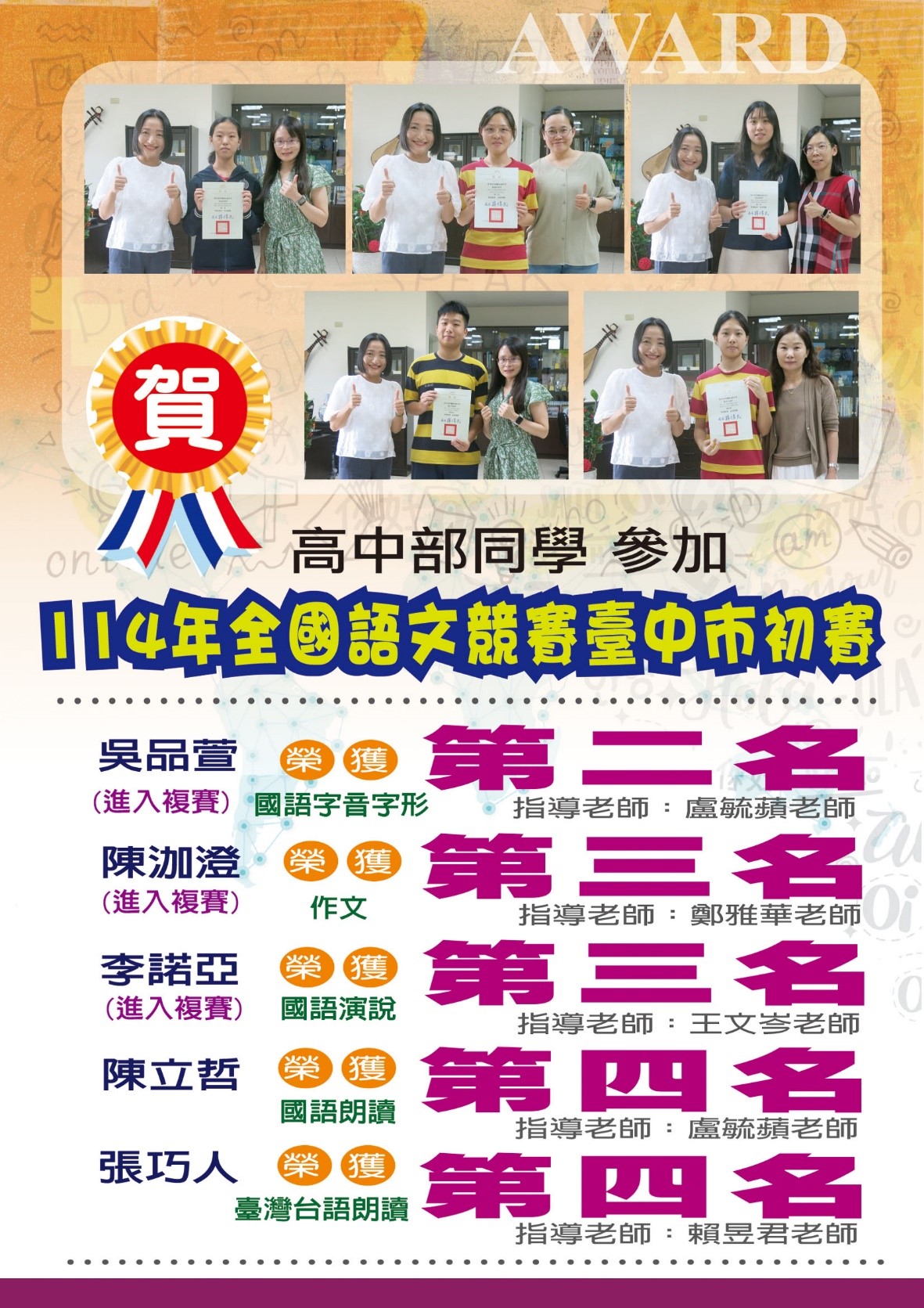 張巧人 同學 "臺灣台語朗讀 第四名" 指導老師:賴昱君