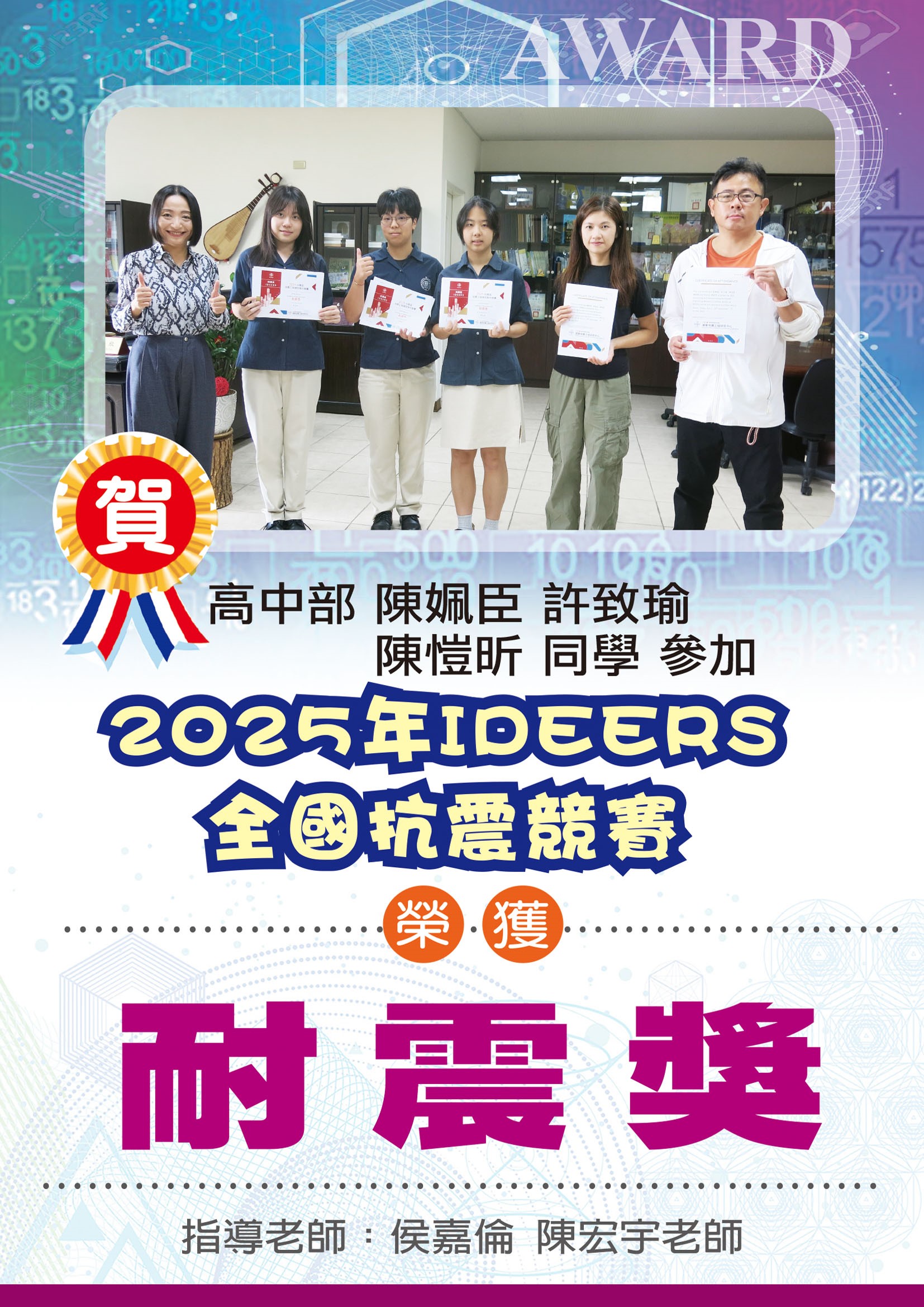 高中部 陳姵臣 許致瑜 陳愷昕 同學 榮獲 耐震獎
