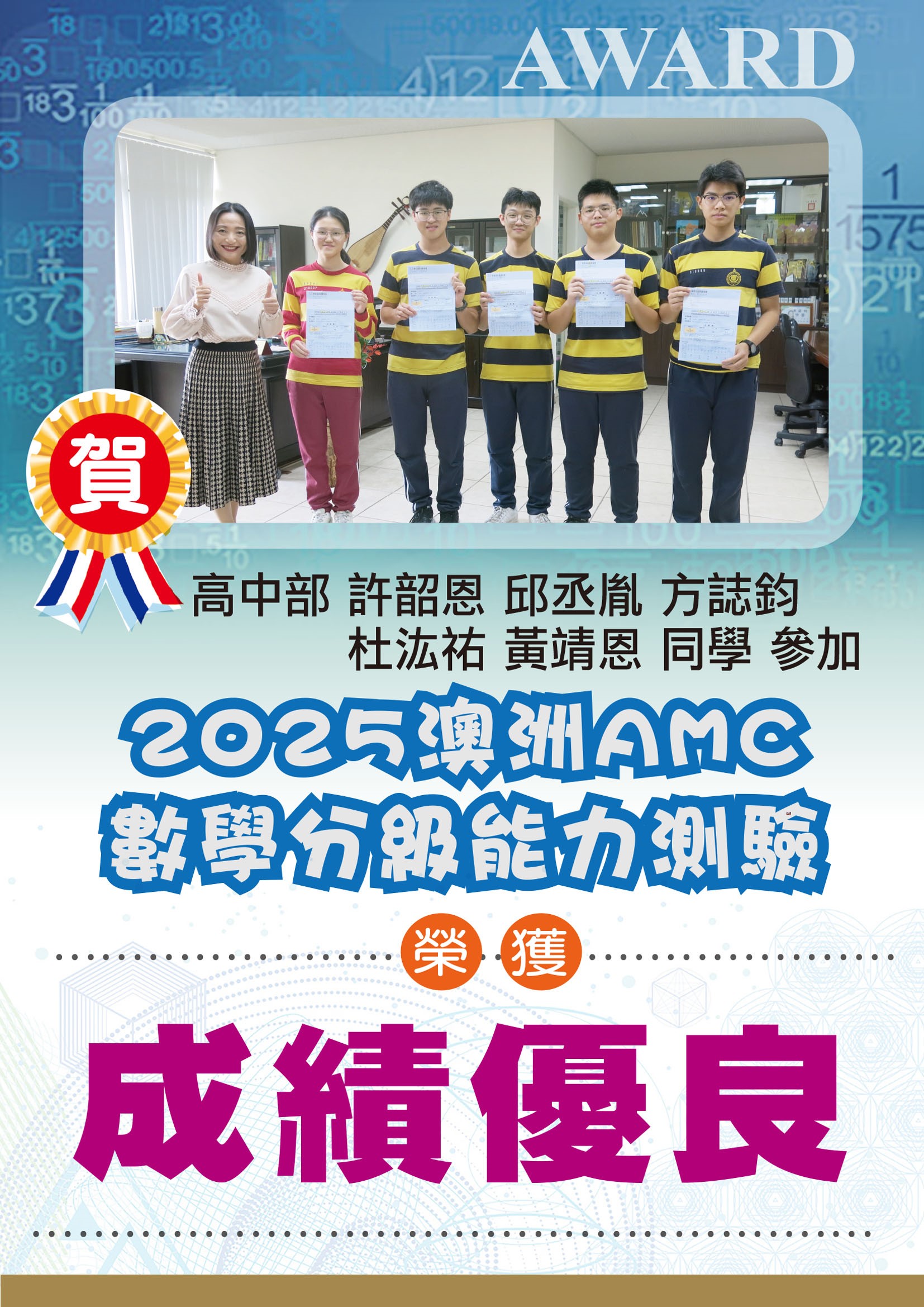 高中部 許韶恩 邱丞胤 方誌鈞 杜汯祐 黃靖恩 同學 榮獲 成績優良