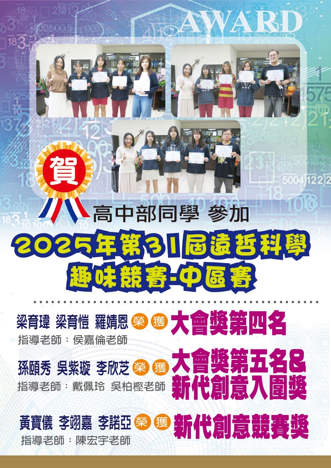 梁育瑋 梁育愷 羅婧恩 同學,榮獲 大會獎第四名,指導老師:侯嘉倫老師