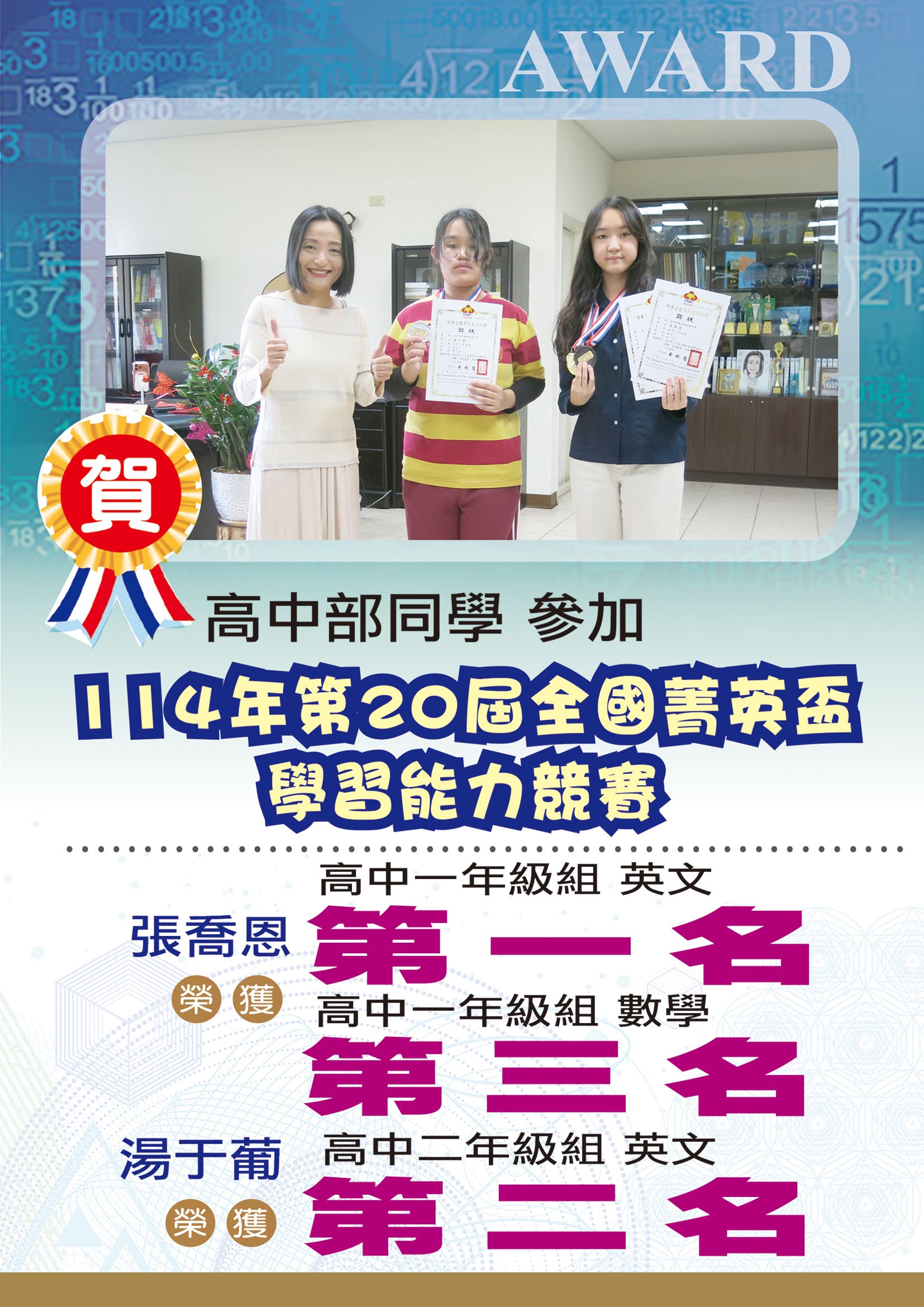 張喬恩 同學 榮獲 高中一年級組英文第一名 & 高中一年級組數學第三名
