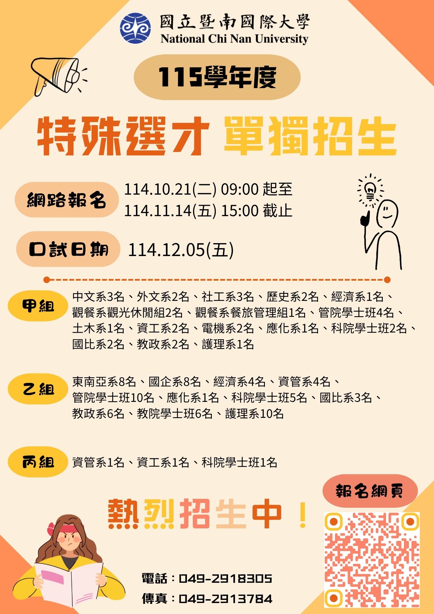 國立暨南國際大學115學年度特殊選才單獨招生,相關資訊如說明,歡迎同學報考。
