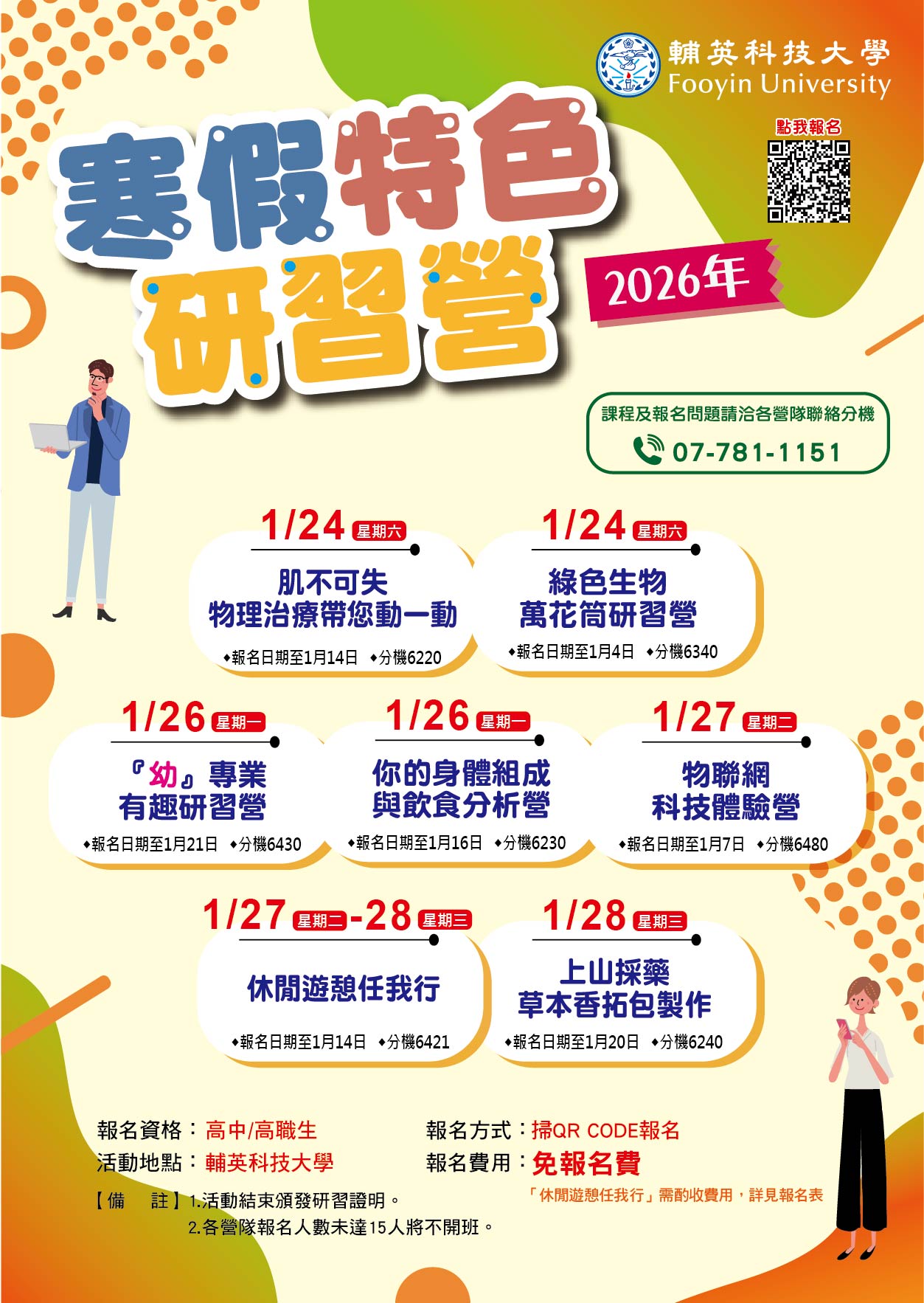 (四)報名方式:請掃描海報上QR CODE或至輔英科技大學首頁 /招生資訊網/研習營連結網址報名