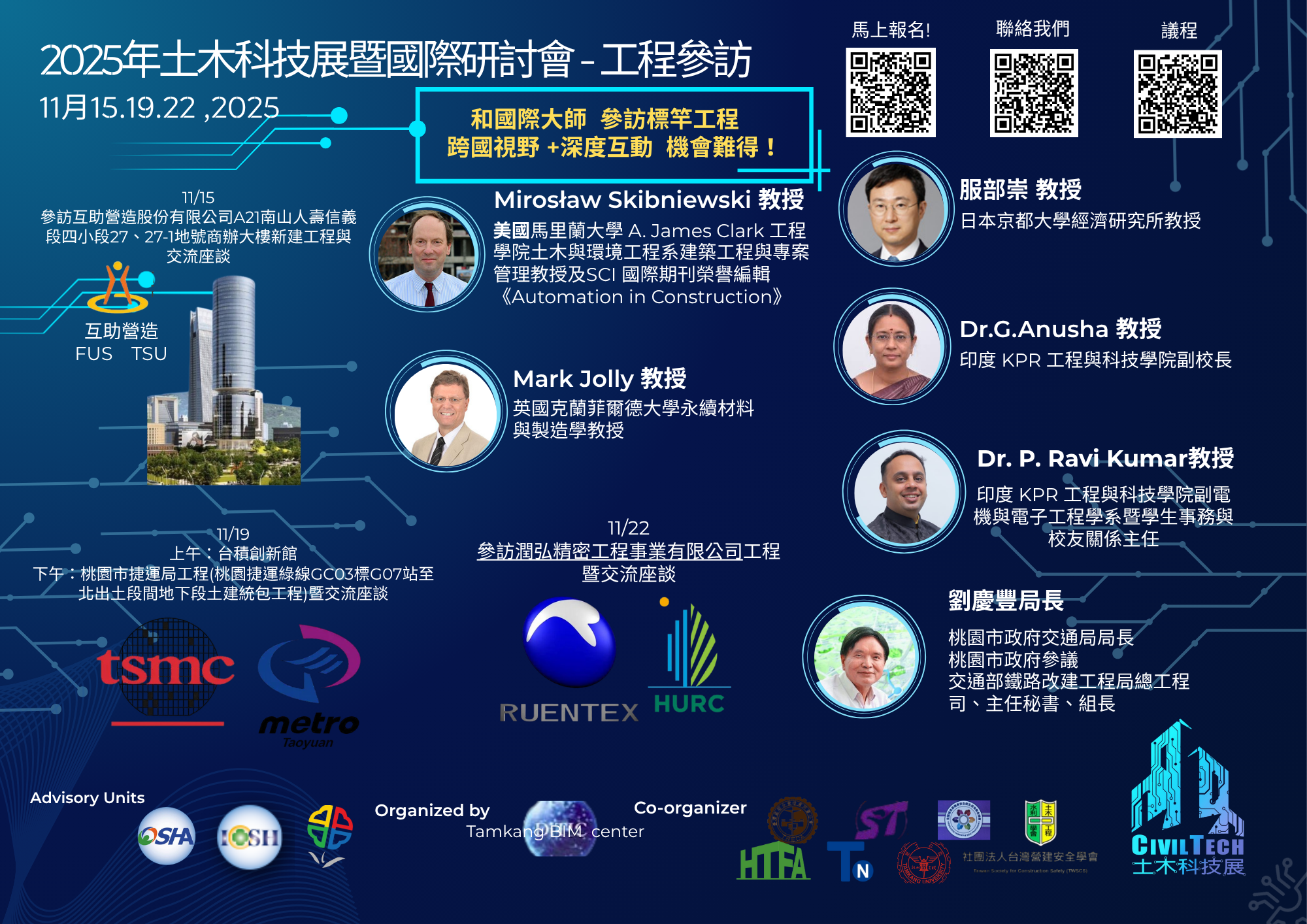 一、旨揭活動為該中心主辦之「2025土木科技展暨國際研討會」系列活動之一,與5名國際大師參與3場工程參訪,深入了解臺灣工程的實力: