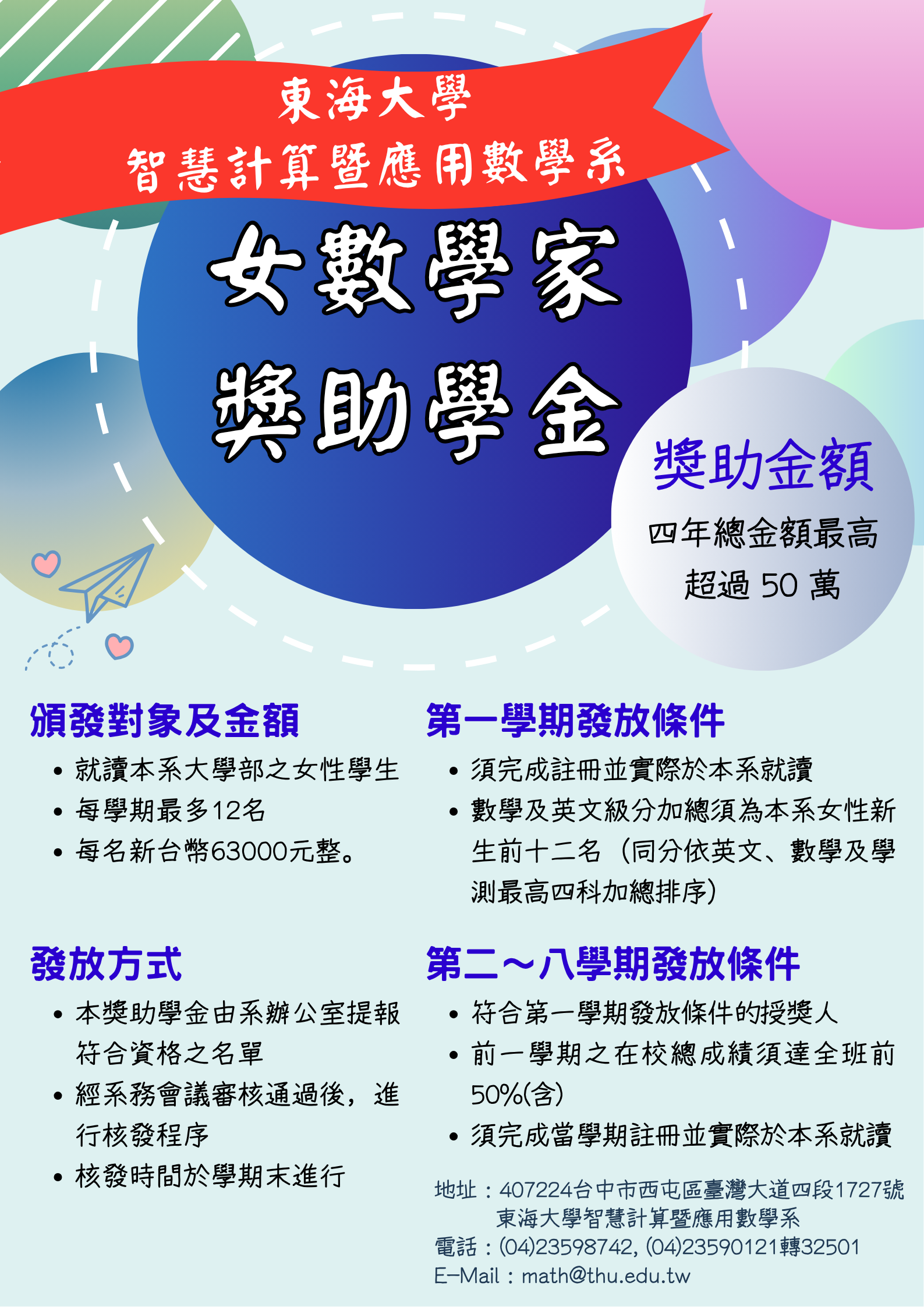 東海大學智慧計算暨應用數學系「東海大學女數學家獎助學金」,相關資訊如說明。