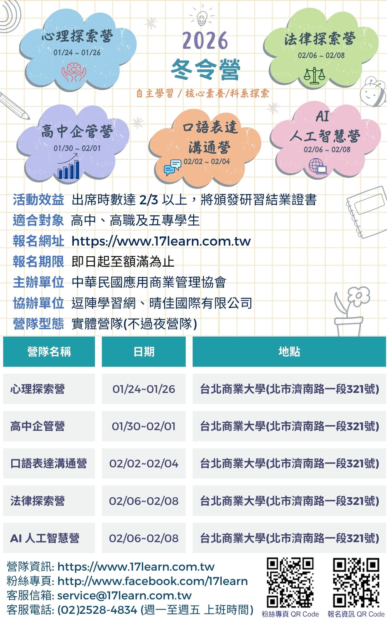 晴佳國際有限公司舉辦【2026 寒假冬令營-卓越領袖探索系列】活動,相關資訊如說明,歡迎同學報名參加。