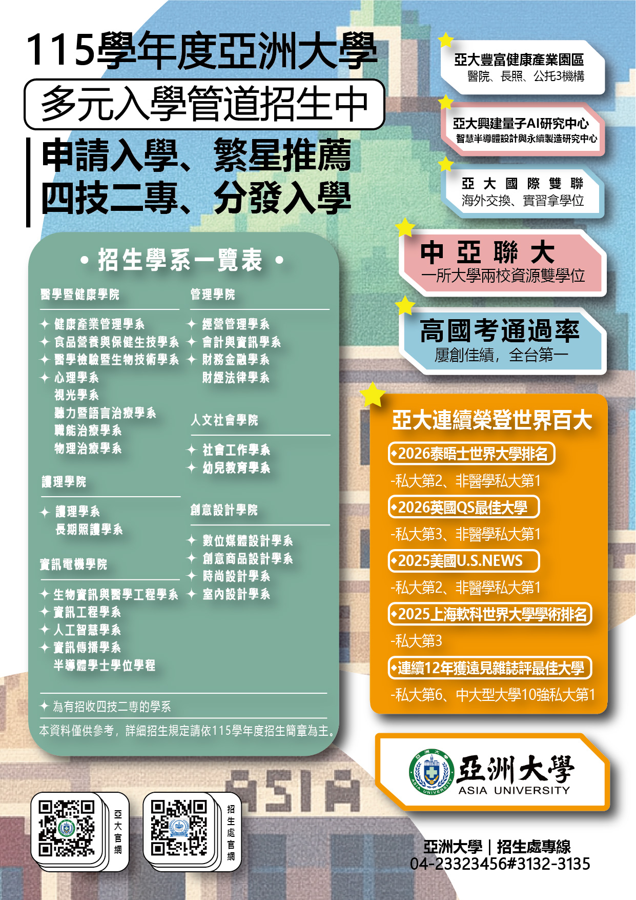 亞洲大學舉辦「亞洲大學院系特色成果展會暨多元入學管道說明會」,相關資訊如說明,歡迎學生及家長和老師報名參加。