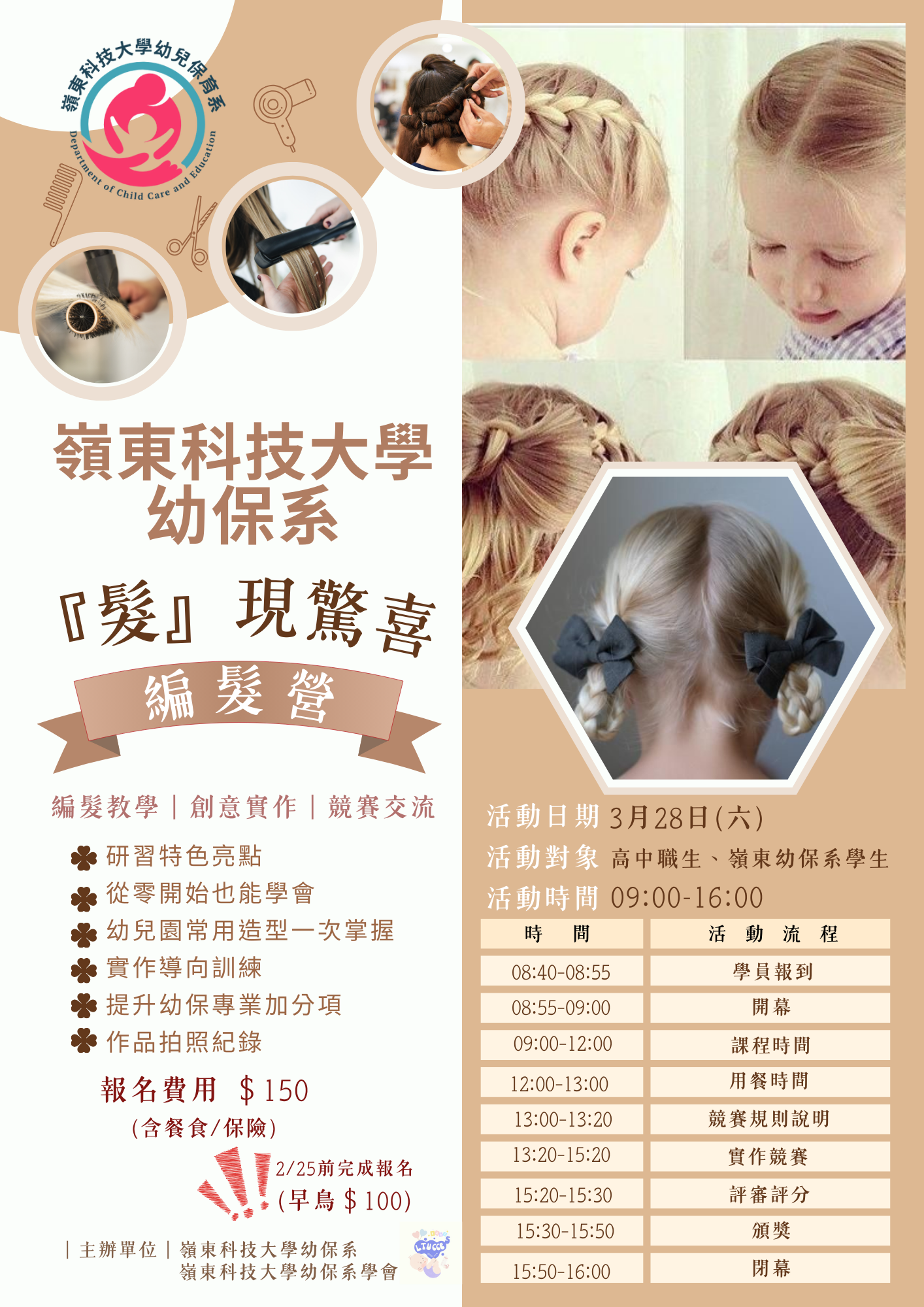 嶺東科技大學幼兒保育系辦理「髮現驚喜編髮營」活動,相關資訊如說明,歡迎同學報名參加。