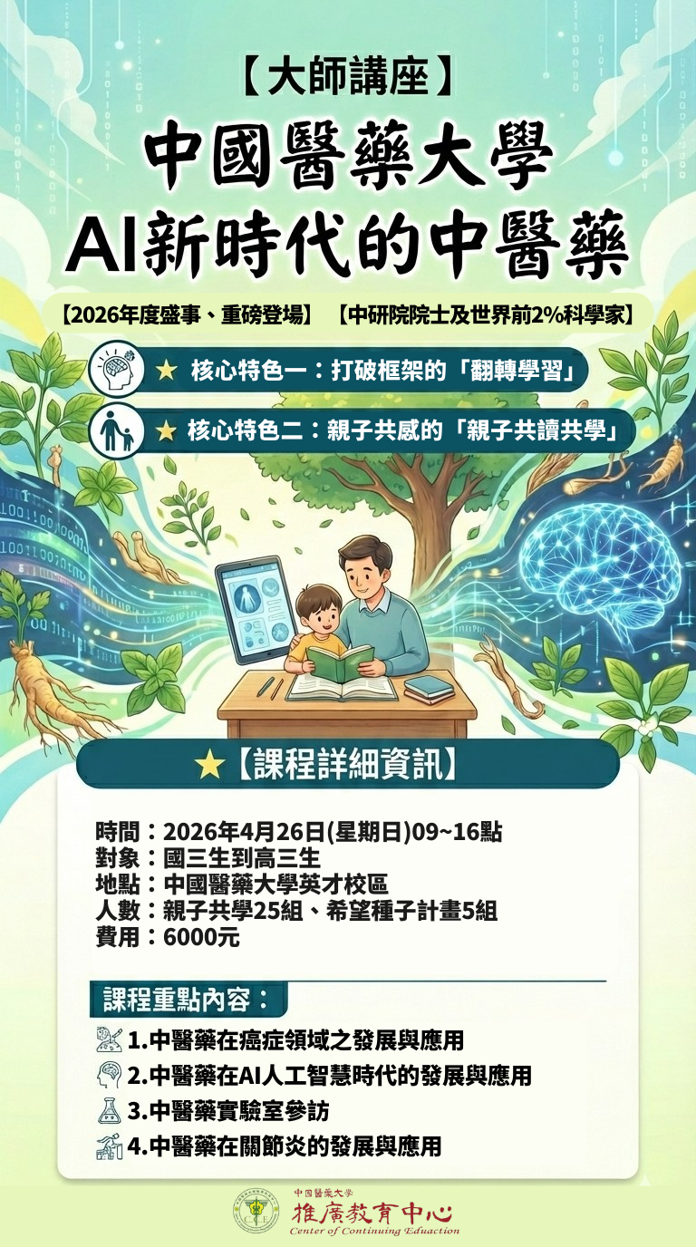 中國醫藥大學推廣教育中心【2026大師講座】AI新時代的中醫藥活動,相關資訊如說明,歡迎同學報名參加。