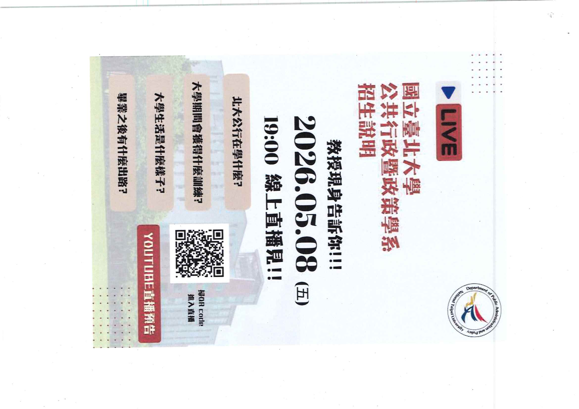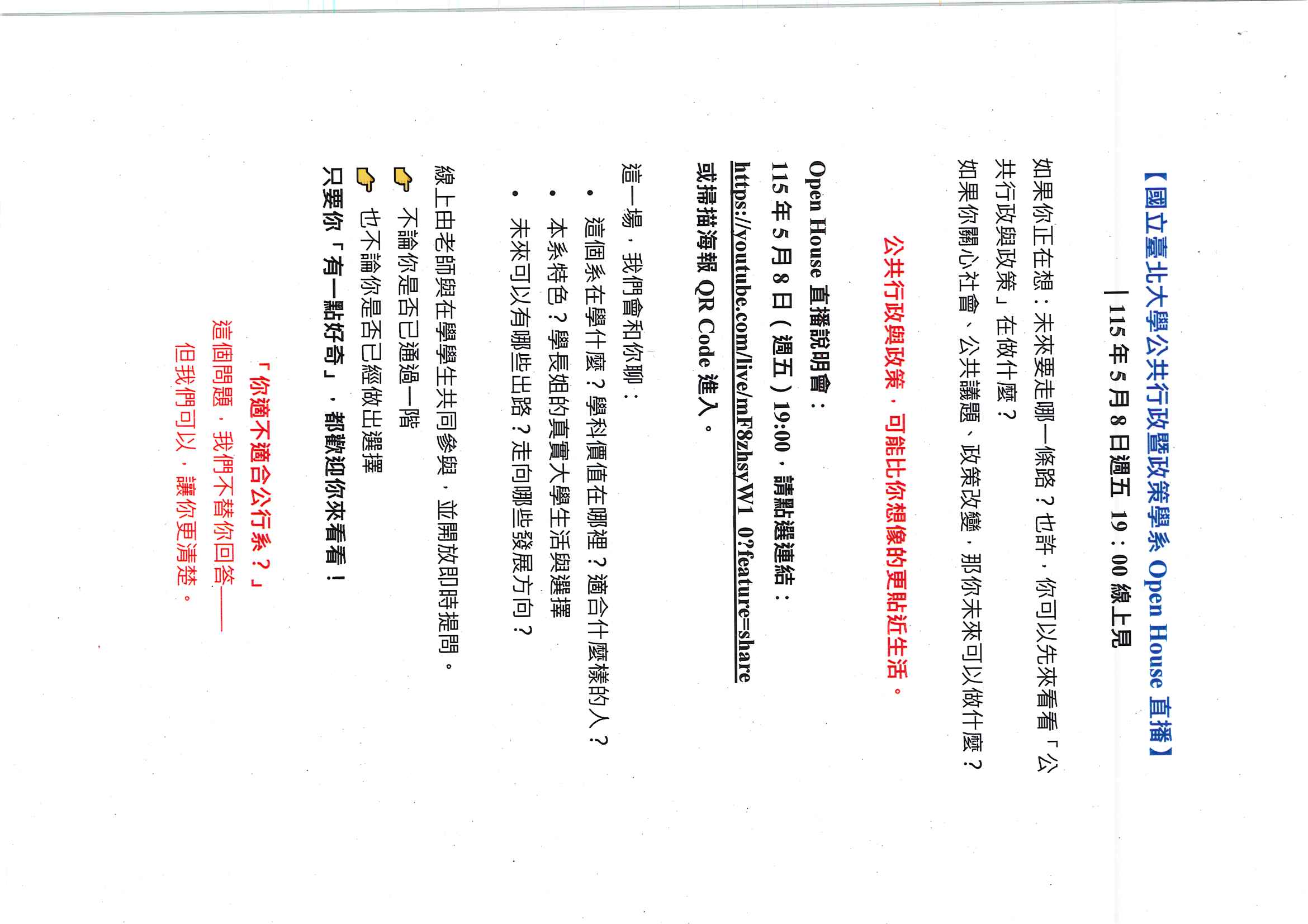 國立臺北大學公共行政暨政策學系舉辦「open house直播」 線上招生說明會,相關資訊如說明,歡迎同學報名參加。