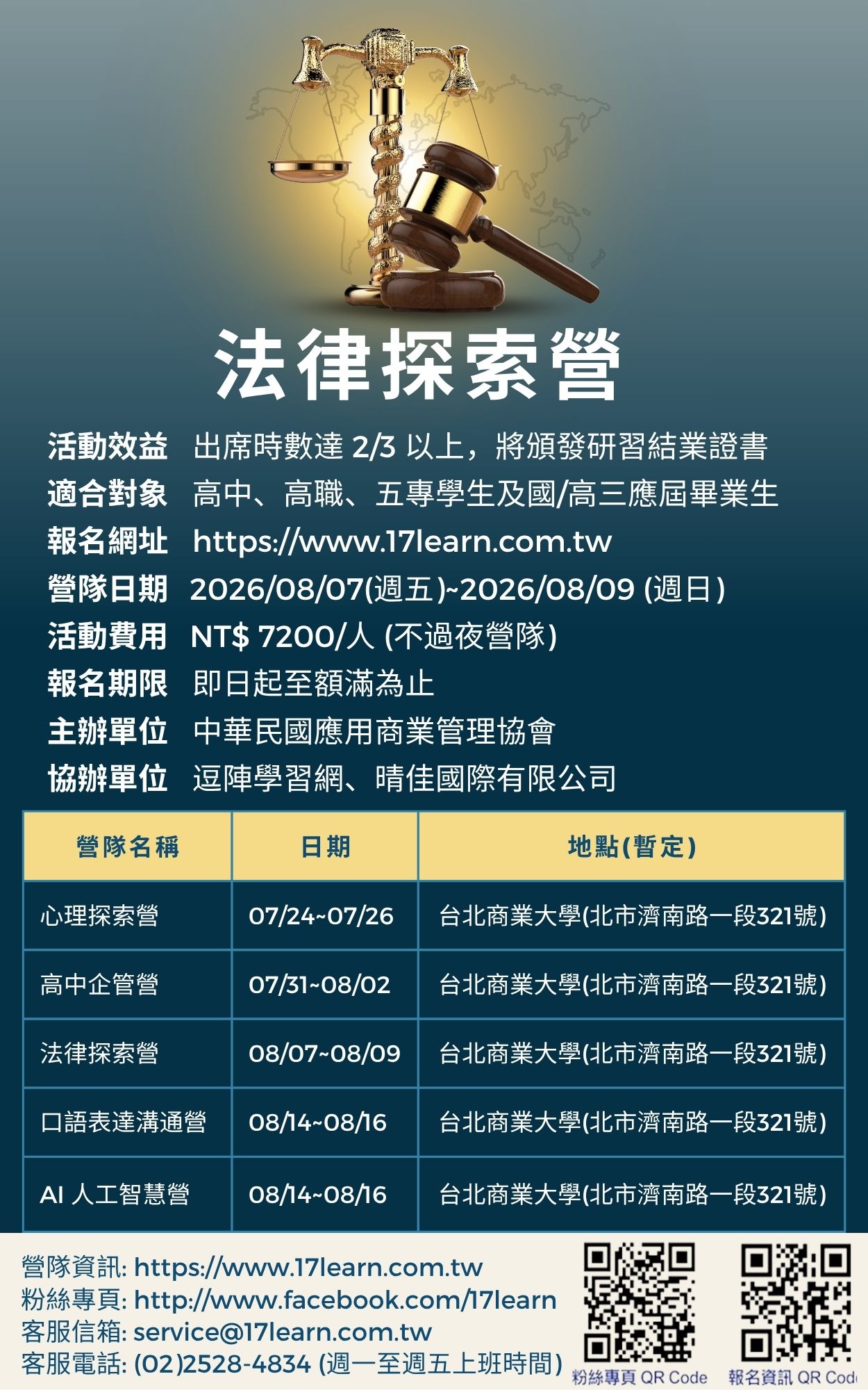 中華民國應用商業管理協會舉辦法律探索營-2026夏令營活動,相關資訊如說明,歡迎有志於往【法政學群】、或相關科系探索體驗的同學踴躍報名參加。