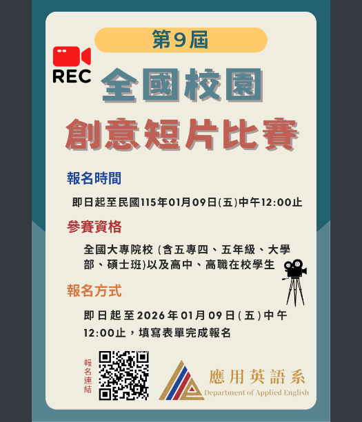 朝陽科技大學應用英語系辦理「第9屆朝陽科技大學應用英語系全國校園創意短片比賽」
