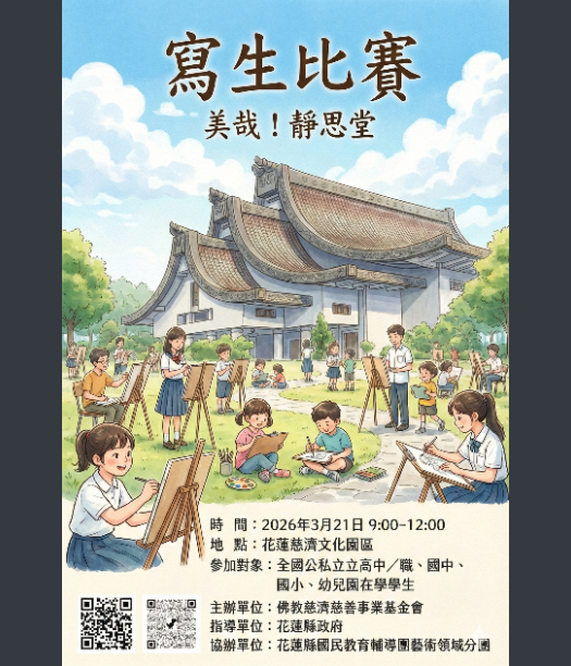 財團法人中華民國佛教慈濟慈善事業基金會與花蓮縣政府將於115年3月21日(六)合作辦理「美哉!靜思堂」寫生比賽
