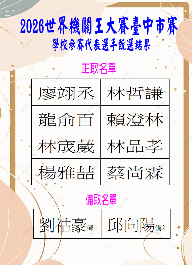國中部2026世界機關王臺中市賽學校代表選手甄選結果