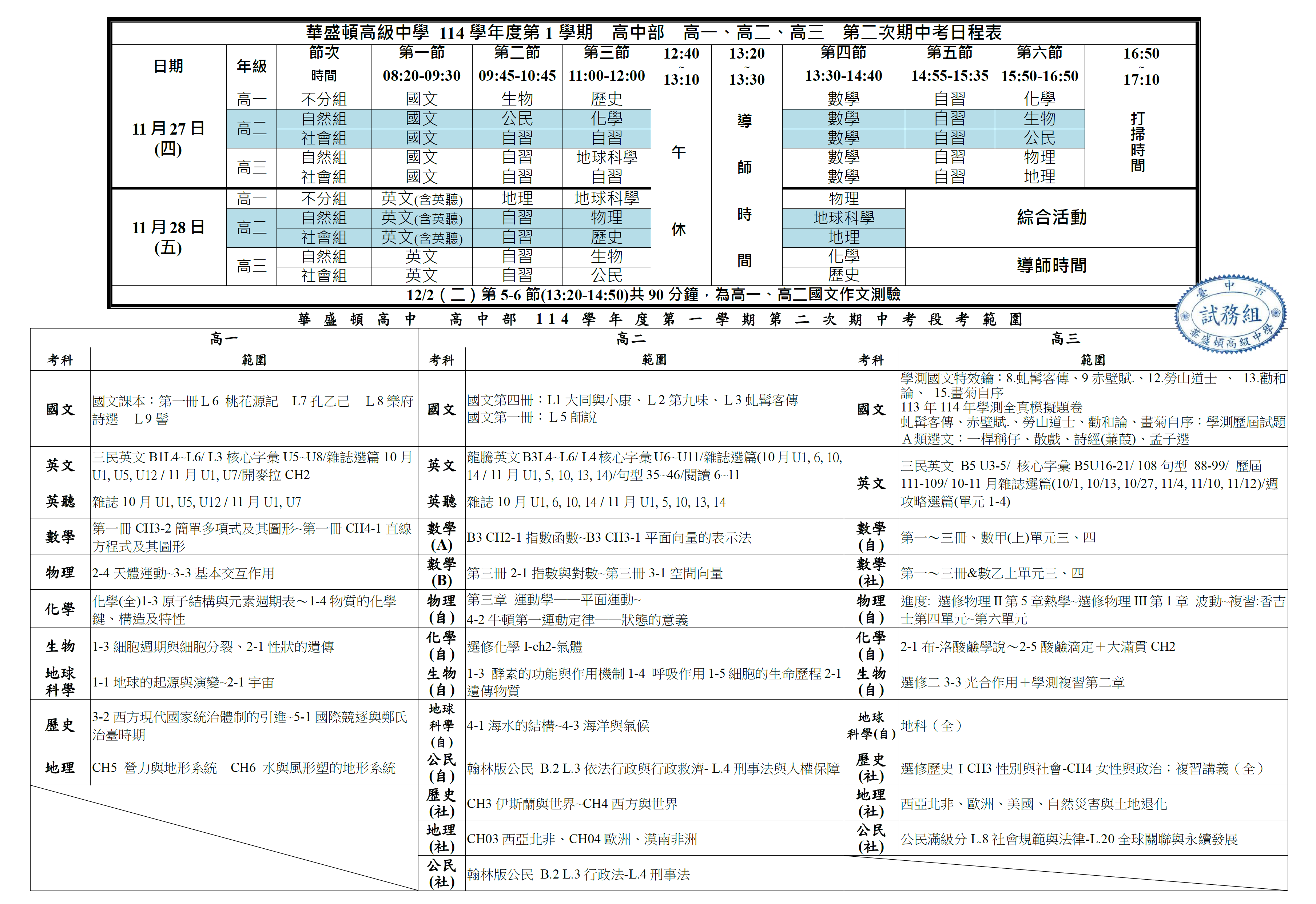 高中部114學年度第1學期第2次期中考日程表暨範圍表