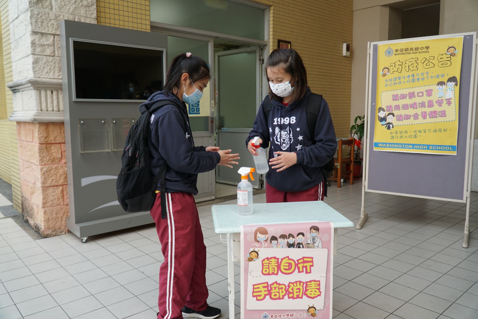華盛頓中學嚴密落實體溫量測,除每日入校前於校門口逐一測量外,進入班級後,早上及中午再各量一次體溫,一日共三次體溫追蹤,以達到校園防疫的最高標準。