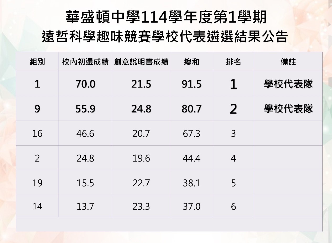 高中部114-1遠哲科學趣味競賽 學校代表遴選結果公告