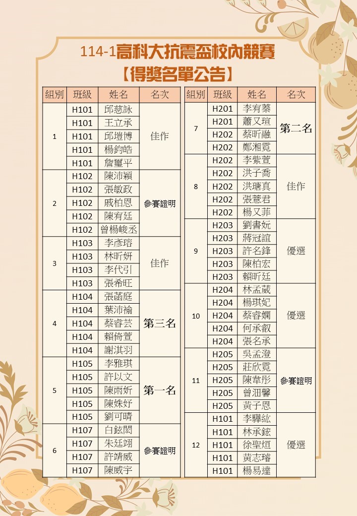 高中部114-1高科大抗震盃校內競賽 得獎名單公告