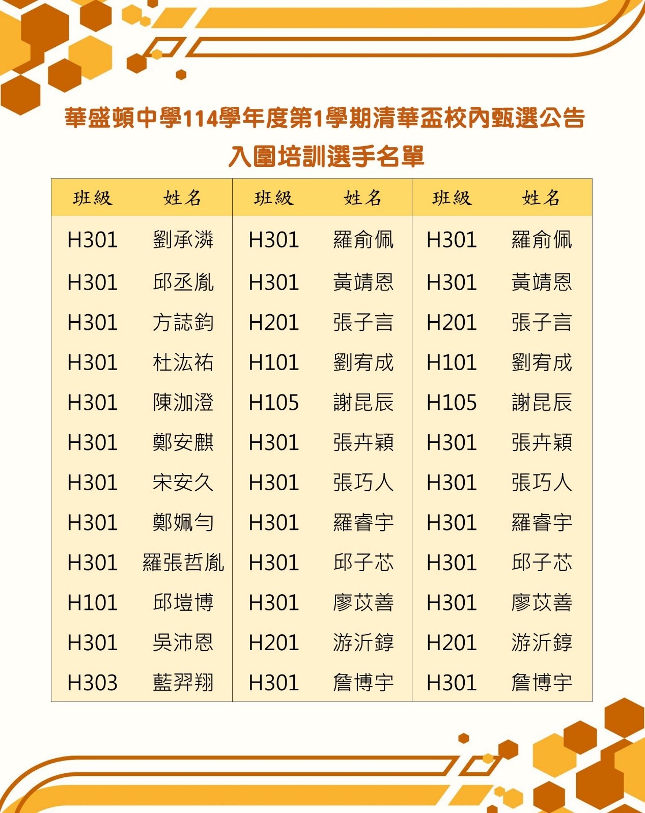高中部114-1清華盃校內甄選 入圍培訓選手名單公告
