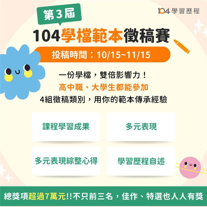 三、活動說明:邀請全臺高中、職學生投稿,高一至高三皆可參加,不限當年度學習歷程! 除先前有投稿過 104 學習歷程範本徵稿賽的作品,不可再投稿外,不限投稿件數。