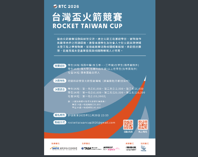 四、競賽活動辦法詳見本中心/2026台灣盃火箭競賽公告https://www.tasa.org.tw/zh-TW/events/detail /067a2757-bac3-4ec6-9dde-5d0eff1927e3