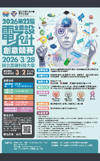 一、本屆全國電子設計創意競賽資訊公告於本校電子工程系(建 工校區)網站-網址為 ec.nkust.edu.tw。