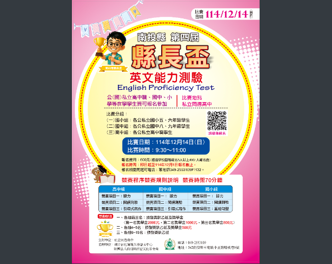【轉知】南投縣第四屆縣長盃中小學生英文能力比賽