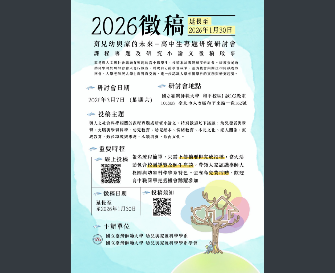 一、活動宗旨:邀請對人文與社會議題有興趣的高中職學生,分享課程專題或研究小論文的成果,讓年輕學子能在公開舞台上展現學習成果與想法,並透過交流拓展學習視野。本活動引導參與的高中職學生更深入了解「幼兒發展與教育」和「家庭生活與教育」領域的特色,以及相關社會議題的實務現況及研究趨勢,希冀透過此平台引導高中職學生認識專業領域。