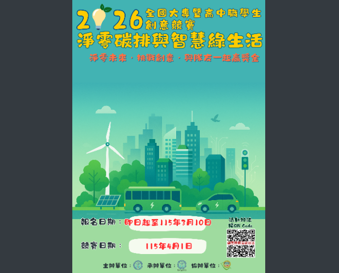一、競賽主題:本競賽以「淨零碳排與智慧綠生活」為主軸,涵蓋多元創新領域,鼓勵學生針對節能減碳、智慧科技應用、永續生活等議題提出創新解決方案,詳細主題範疇如附件所列。
