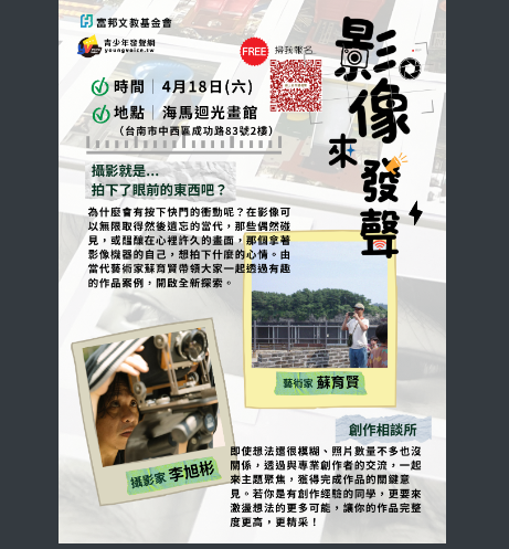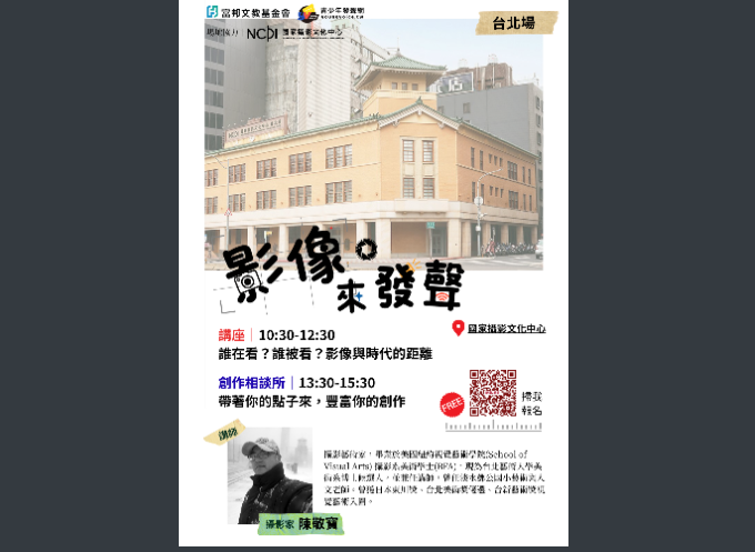 二、本次辦理「影像來發聲」全台系列活動,於台北、台中、台南三地舉行,包含影像講座、創作工作坊及作品交流,帶領學生從觀看影像到發展個人創作。
